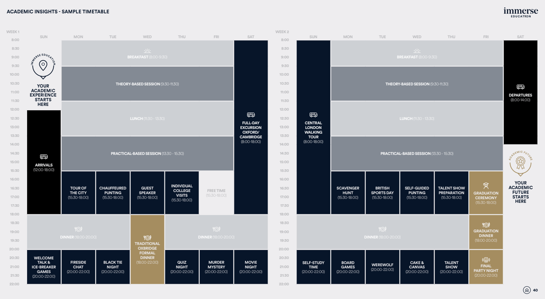 Immerse Education(以下IE)は、2012年に設立されたイギリスの教育団体です。世界の名門大学である、オックスフォード大学やケンブリッジ大学、ユニバーシティ・カレッジ・ロンドン、シドニー大学、UCバークレー、コロンビア大学、サフォーク大学、東京大学、トロント大学などで、他のサマースクールでは類を見ない、これからの将来に必要なアカデミック・職業選択のためのプログラムを開催しており、毎年数千人が参加しています。